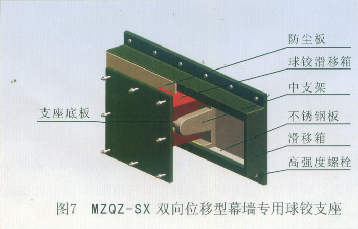 支座結(jié)構(gòu)如圖7。其主要由支座底板、球鉸滑移箱、中支架、不銹鋼板、滑移箱、防塵板和高強(qiáng)度連接螺栓組成。球鉸滑移箱內(nèi)部采用萬向轉(zhuǎn)角軸承,軸承內(nèi)圈與中支架之間采用簡支梁形式的銷軸連接。軸承內(nèi)、外圈的相對(duì)轉(zhuǎn)動(dòng)實(shí)現(xiàn)支座的萬向轉(zhuǎn)角功能。此類支座中軸承內(nèi)圈與銷軸有兩種配合形式:1、軸承內(nèi)圈與銷軸之間采用間隙配合,其相對(duì)滑動(dòng)實(shí)現(xiàn)較小位移,與銷軸軸線垂直方向的位移是通過軸承座與球鉸滑移箱箱體之間的不銹鋼板和聚四氟乙烯滑板之間的滑動(dòng)實(shí)現(xiàn),支座的橫軸向位移均是在球鉸滑移箱內(nèi)實(shí)現(xiàn),可大大減小與主體結(jié)構(gòu)的配合尺寸;2、軸承內(nèi)圈與銷軸之間采用過盈配合,銷軸與軸承內(nèi)圈相對(duì)固定,通過滑移箱與中支架之間的不銹鋼板和聚四氟乙烯滑板的相對(duì)滑動(dòng)來實(shí)現(xiàn)軸向位移。與之垂直方向的位移是通過軸承外圈所套方形軸承座與箱體間的不銹鋼板和聚四氟乙烯滑板的相對(duì)滑動(dòng)實(shí)現(xiàn)。