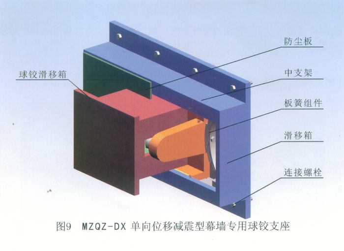 支座結(jié)構(gòu)如圖9。其主要由球鉸滑移箱、中支架、板簧組件、滑移箱、連接螺栓和防塵板組成。此類