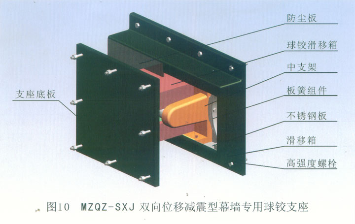 支座的橫軸向位移均是在球鉸滑移箱內(nèi)實(shí)現(xiàn),可大大減小與主體結(jié)構(gòu)的配合尺寸;2、軸承內(nèi)圈與銷軸之間采用過盈配合,銷軸與軸承內(nèi)圈相對(duì)同定,通過滑移箱與中支架之間的不銹鋼板和聚四氟乙烯滑板的相對(duì)滑動(dòng)來實(shí)現(xiàn)位移,中支架與滑移箱側(cè)壁向根據(jù)位移量的不同設(shè)有板簧或橢網(wǎng)形板簧,板簧在位移過程中的形變起到減震阻尼的作用。銷軸水平徑向的位移是通過軸承外圈所套方形軸承座與箱體間的不銹鋼板和四氟滑板的相對(duì)滑動(dòng)實(shí)現(xiàn)。